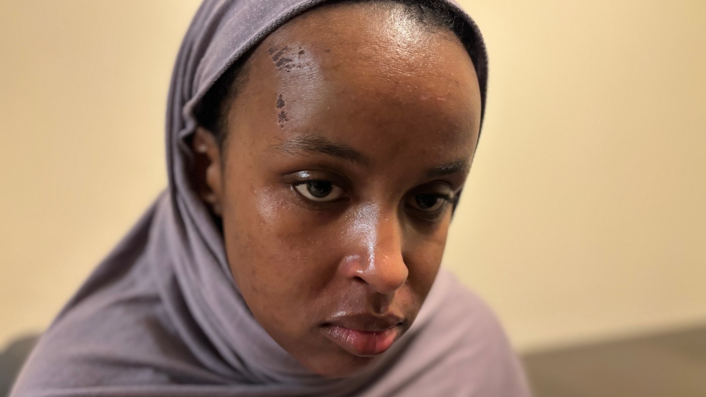 Nasra Ahmed, 23, tilted her face to the side Sunday evening to show the broken skin and bruising she said she suffered on the side of her head when U.S. Immigration and Customs Enforcement agents shoved her to the ground of a parking lot outside the apartment complex where she lives with relatives.