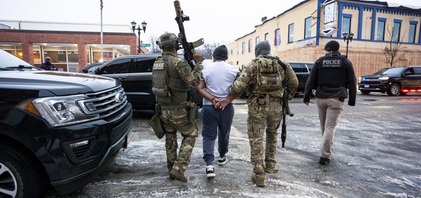 Agentes federales llevando a cabo operaciones de control migratorio en Minneapolis el 6 de enero de 2026. (Fotografía del Departamento de Seguridad Nacional por Tia Dufour)