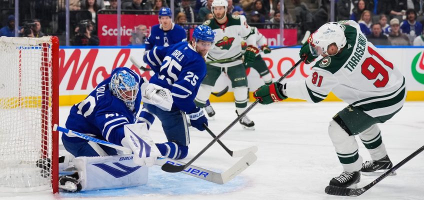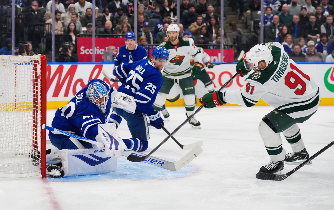 The Wild were outshot early, but they made their first shot on goal count. On the game’s first power play, Ryan Hartman fed a pass to Tarasenko, alone at the side of the Toronto crease, and the Russian veteran snapped in his 10th goal of the season.