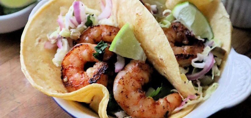 Tacos are a welcome weeknight meal because they don’t take a lot of time or effort. These feature quick marinated shrimp and an easy green cabbage slaw. They’re simple but super satisfying.