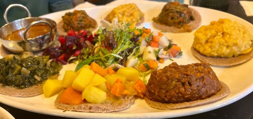 For our main course, we ordered the super veggie platter, a massive plate littered with colorful dollops of yellow and brown lentils, greens, green beans, potatoes and carrots, beets and more. And because my son wanted meat, we ordered some chicken tibs — bite-sized pieces of chicken bathed in a flavor-packed, deep-red sauce. We ate it all with spongy, tangy injera bread, torn into little pieces and used to pick up the vegetables and meat. It’s such a fun and interactive way to have a meal, and I was so glad to introduce my kid to it on a night when everything felt like it was going sideways in our cities.