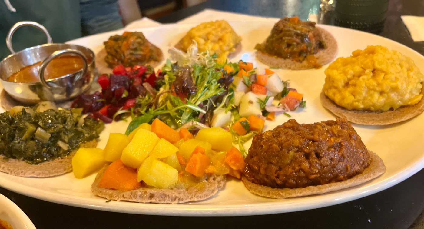 For our main course, we ordered the super veggie platter, a massive plate littered with colorful dollops of yellow and brown lentils, greens, green beans, potatoes and carrots, beets and more. And because my son wanted meat, we ordered some chicken tibs — bite-sized pieces of chicken bathed in a flavor-packed, deep-red sauce. We ate it all with spongy, tangy injera bread, torn into little pieces and used to pick up the vegetables and meat. It’s such a fun and interactive way to have a meal, and I was so glad to introduce my kid to it on a night when everything felt like it was going sideways in our cities.