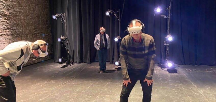 As part of an engagement presented by Schubert Club Mix at the Luminary Arts Center, six audience members at a time don headsets and walk around the Luminary stage, “seeing” musicians perform and hearing their music through headphones.