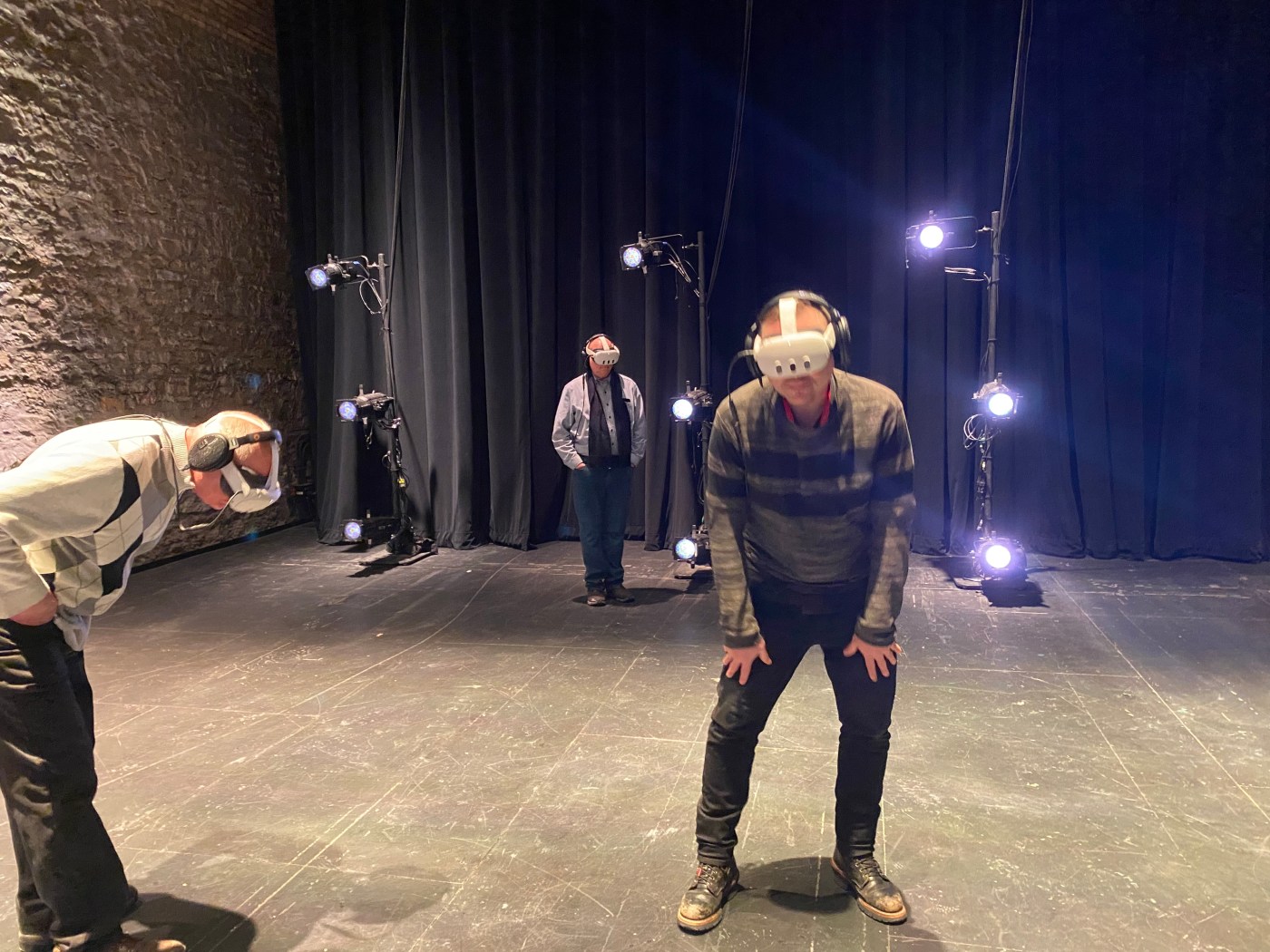 As part of an engagement presented by Schubert Club Mix at the Luminary Arts Center, six audience members at a time don headsets and walk around the Luminary stage, “seeing” musicians perform and hearing their music through headphones.