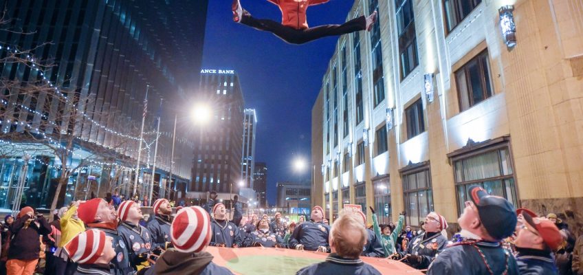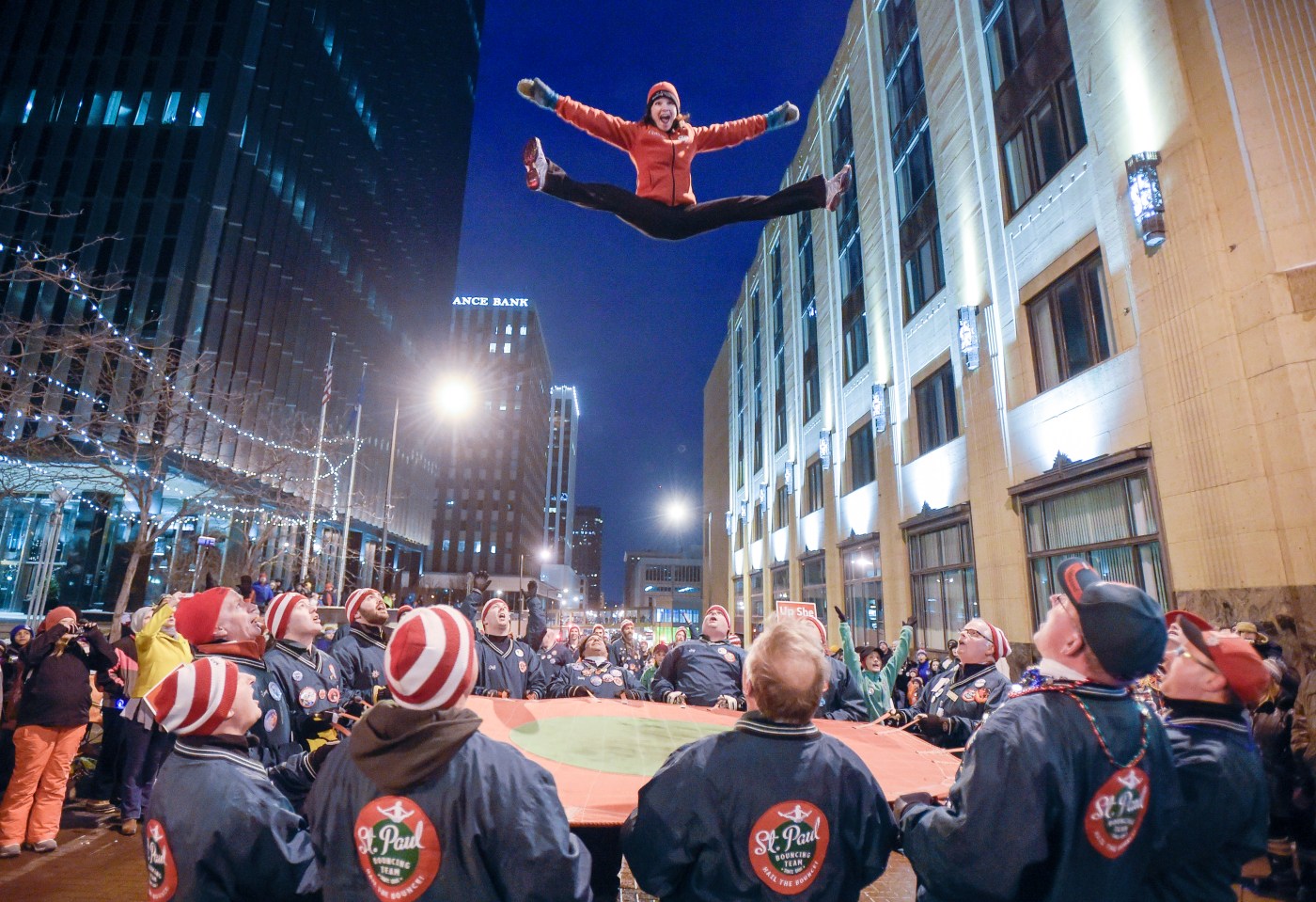 Carrying on the Winter Carnival’s oldest tradition, the St. Paul Bouncing Team still flies upward