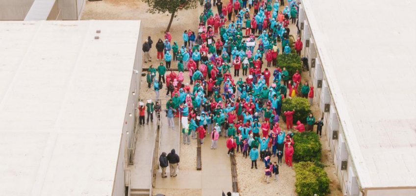 Aerial photos taken by The Associated Press showed children and parents at the South Texas Family Residential Center clad in jackets and sweaters, some of them holding signs that included “Libertad para los niños,” or “Liberty for the kids.”