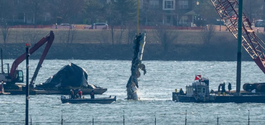 FILE – Rescue and salvage crews pull up a part of a Army Black Hawk helicopter that collided midair with an American Airlines jet, at a wreckage site in the Potomac River from Ronald Reagan Washington National Airport, Feb. 6, 2025, in Arlington, Va. (AP Photo/Jose Luis Magana, File)