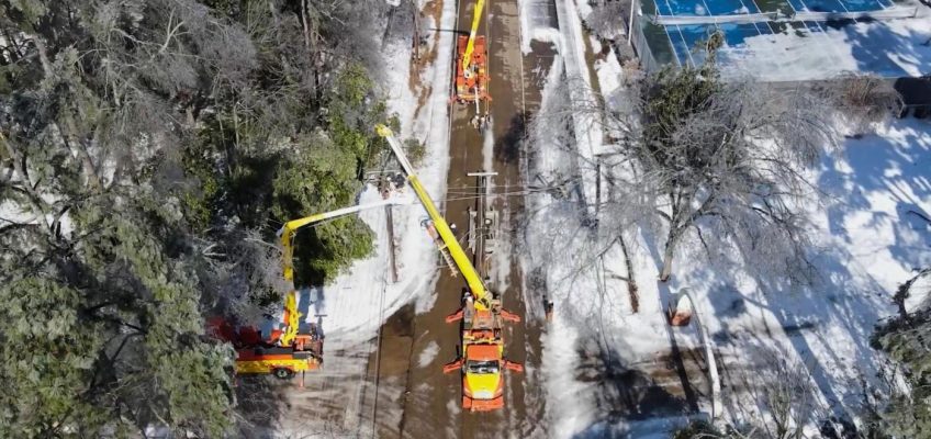 This image taken from a video released by the city of Oxford, Miss., shows crews working on power lines Tuesday, Jan. 27, 2026. (City of Oxford Mississippi via AP)