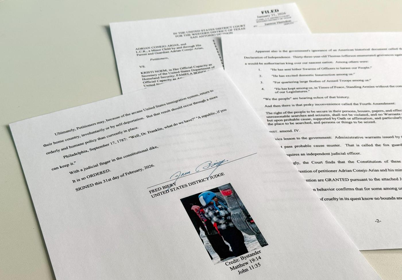 Biery also included in his ruling a photo of Liam Conejo Ramos and references to two lines in the Bible: “Jesus said, ’Let the little children come to me, and do not hinder them, for the kingdom of heaven belongs to such as these,” and “Jesus Wept.”