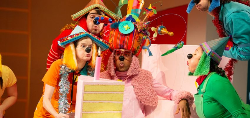 Kimberly Richardson, from left, Julia Diaz, Zachary David Hodgkins and Cooper Lajeunesse in Children’s Theatre Company’s production of “Go Dog Go! Ve Perro Ve!,” a bilingual adaptation of P.D. Eastman’s children’s book, in which dogs drive, swim, play baseball and race to a big dog party. The show runs through Feb. 22, 2026 at the Minneapolis theater. (Kaitlin Randolph / Children’s Theatre Company)