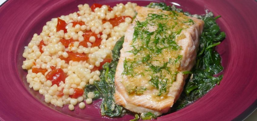 Quick Fix: Garlic and Herb Salmon on Creamy Spinach with Pimento Couscous