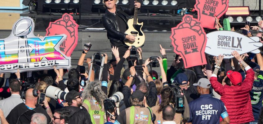 The pop-punk band Green Day performed a relatively uncontroversial medley of its hits at the opening ceremony before Super Bowl LX in Santa Clara, California, on Sunday.
