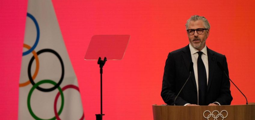 FILE – Casey Wasserman, LA28 chairperson and president, takes questions from the media during a news conference in Los Angeles, Thursday, June 5, 2025. (AP Photo/Damian Dovarganes, File)