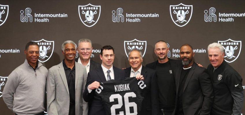 Three took seats to the left and the other three to the right before new Las Vegas coach Klint Kubiak was formally introduced Tuesday and sat with general manager John Spytek in the middle with the club’s three Lombardi Trophies in front of them.