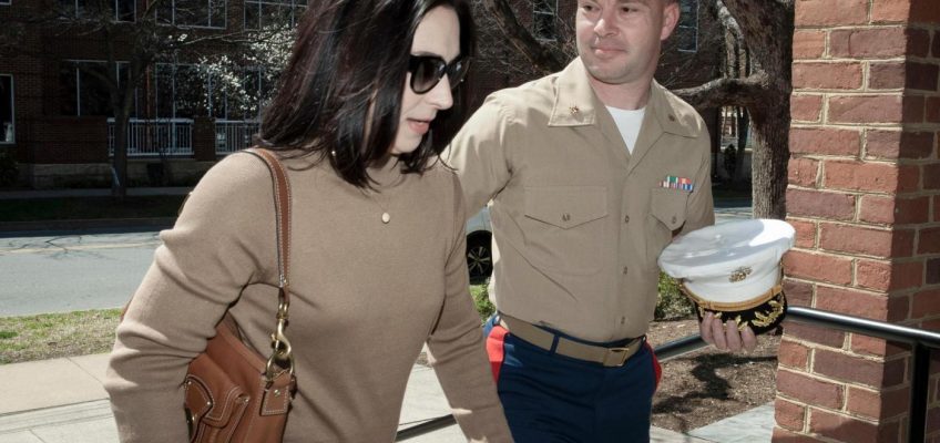 FILE – Marine Maj. Joshua Mast and his wife, Stephanie, arrive at Circuit Court, Thursday, March 30, 2023, in Charlottesville, Va. (AP Photo/Cliff Owen, File)