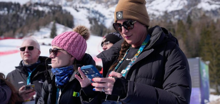 ESPN reporters Sarah Spain, right, and Alex Azzi wait to interview the athletes after the first run of an alpine ski women’s giant slalom race at the 2026 Winter Olympics in Cortina d’Ampezzo, Italy, Sunday, Feb. 15, 2026. (AP Photo/Andy Wong)