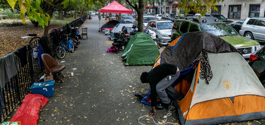 New Yorkers experiencing homelessness who were camping out on a Lower Manhattan sidewalk in 2021 near Tompkins Square Park, where officials later carried out a cleanup. (Adi Talwar/City Limits)