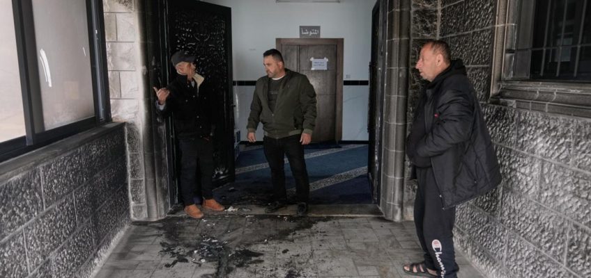 Worshippers coming for the first prayers of the day found the damage and a still smoldering fire, which spewed black smoke across the entrance of the Abu Bakr Al-Siddiq Mosque in the town of Tell, near Nablus, and stained the ornate doorway.