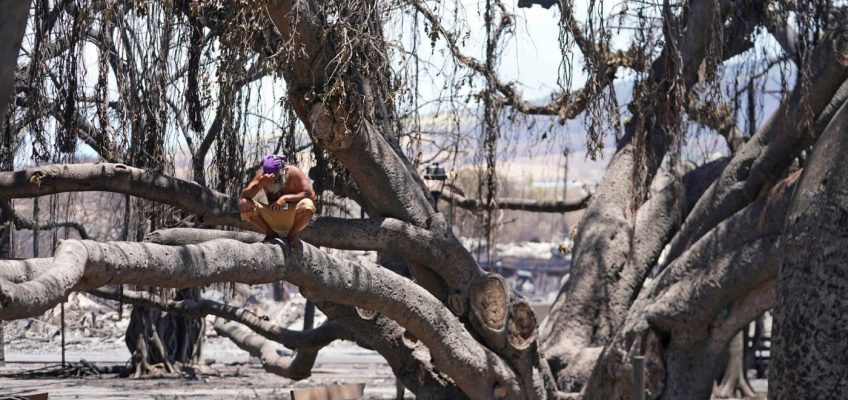 Lahaina Banyan Court Park is surrounded by reminders of the fire — the charred shell of the Old Lahaina Courthouse, melted lamp posts, vacant lots where restaurants and shops once stood — but the tree itself and the wooden benches around its trunk appear remarkably normal.