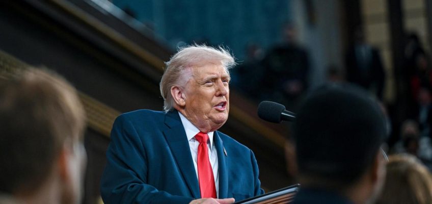 President Donald Trump delivers the State of the Union address to a joint session of Congress in the House chamber at the U.S. Capitol in Washington, Tuesday, Feb. 24, 2026. (Kenny Holston/The New York Times via AP, Pool)