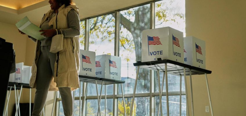FILE – A Vote Here sign is posted amongst political signs as people arrive to vote at the Rutherford County Annex Building, an early voting site, Oct. 17, 2024, in Rutherfordton, N.C. (AP Photo/Kathy Kmonicek, File)