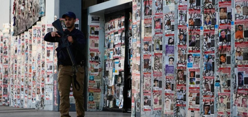 A police officer walks past posters bearing the faces of missing persons in front of the Special Prosecutor’s Office for Missing Persons in Guadalajara, Mexico. Wednesday, Feb. 25, 2026. (AP Photo/Marco Ugarte)