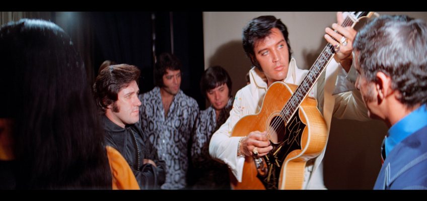 While we become familiar with the faces of his band members, the film doesn’t bother to mention any of their names, not even in the credits. They deserve better, but the film is about how the concert felt, not how it came to fruition. Still, once you get over the contact high of Elvis’ psychedelic neon pink paisley shirt in the rehearsal studio, it’s delightful to see that he gives as much of himself when performing in a small setting as he does in a massive one. He loses himself in thrall to the beat, gyrating his pelvis so fast it resembles a machine gun.