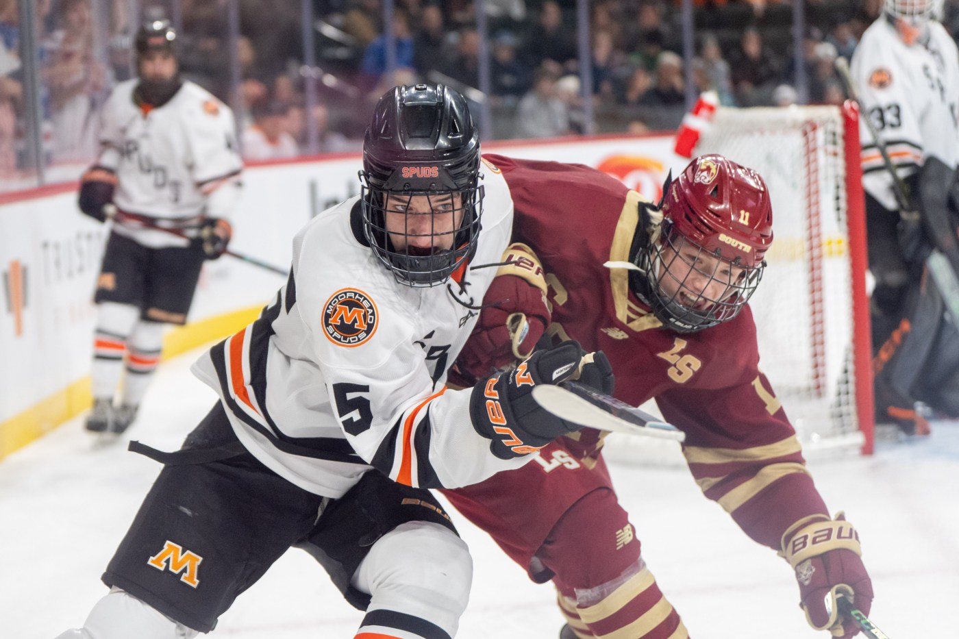 The No. 3-ranked, defending state champion Spuds are at state for the seventh time in eight seasons and are coming off their first-ever state championship, in their ninth title-game appearance. Moorhead is 24-3-1 overall, its only losses coming against No. 1-ranked Rogers (5-3), No. 2-ranked Minnetonka (4-2) and Grand Forks (N.D.) Central (5-4), which is 24-2-3 and met rival Grand Forks Red River in the North Dakota state championship game on Saturday. Moorhead is the state’s highest-scoring team in Class 2A (6.0 goals per game) and allows 2.29 goals per game. The Spuds convert at an incredible 34.4% (33-for-96) on the power play and kill penalties at an impressive 83.1% clip. Sophomore goalie Will Arnold (5-feet-11, 180 pounds) has been outstanding in his first season of high school hockey, going 20-2-1 with a 2.17 GAA, an .892 save pct. and 5 shutouts. Senior forward Tyden Bergeson, an Augustana commit, leads the Spuds in points (27-48—75) and is second in the state in assists. Junior and University of Minnesota Duluth commit Max Cullen — son of former Moorhead, St. Cloud State and Minnesota Wild star Matt Cullen — is second on the team (25-34–59). His brother, sophomore Joey Cullen, is also a dynamic player, who has 17-20–37 this season. Senior defenseman Brandon Mickelson has 21-38–59 from the blue line, while junior forward Zac Zimmerman has 24-34—58.