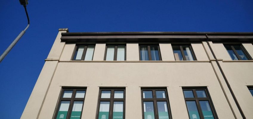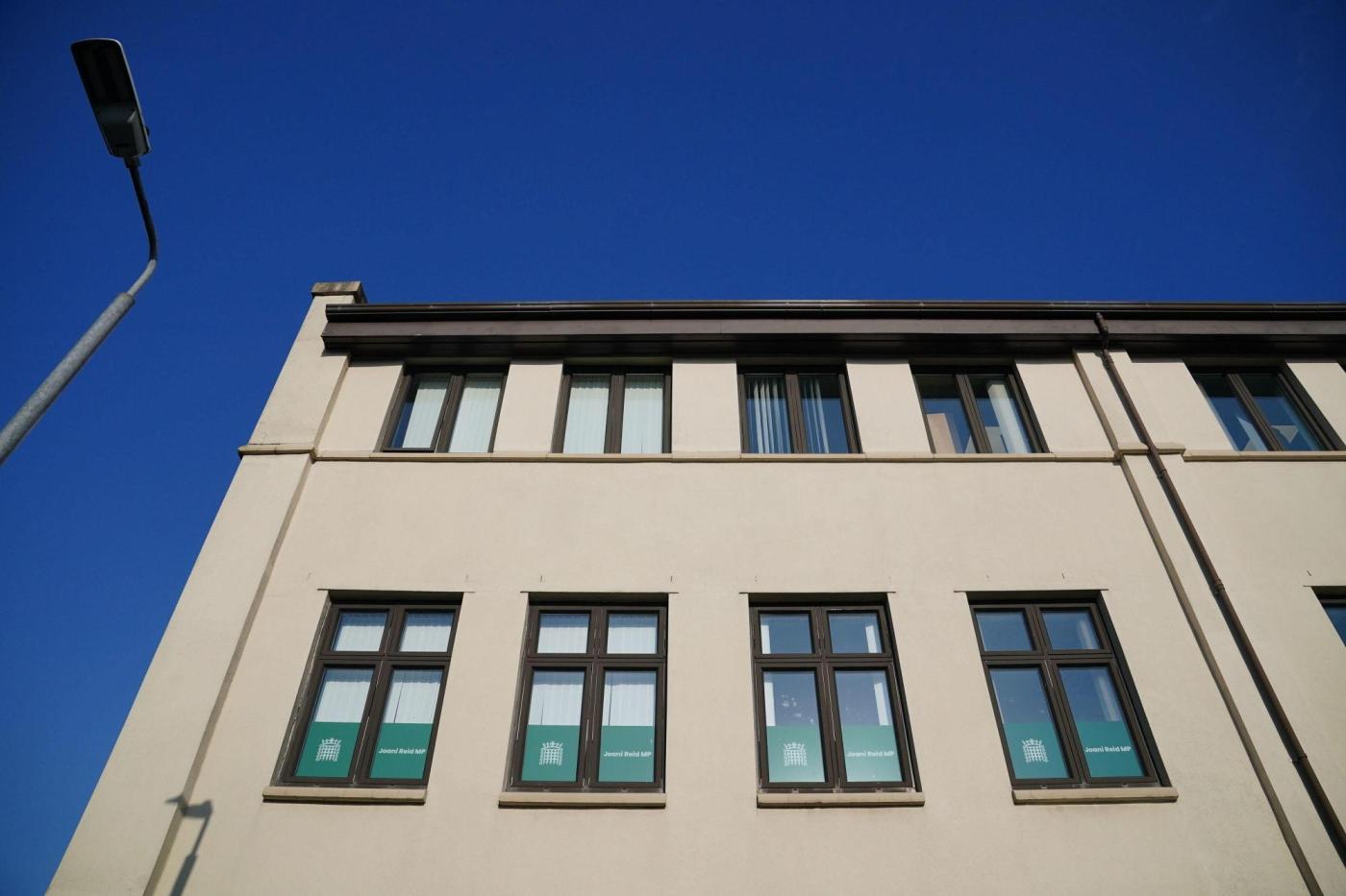 Signage at the constituency office of Joani Reid at Jacobean House in East Kilbride, Scotland, Wednesday, March 4, 2026. (Jane Barlow/PA via AP)