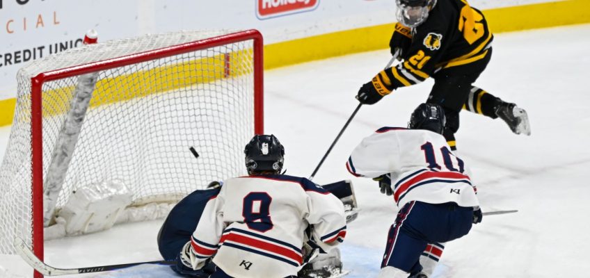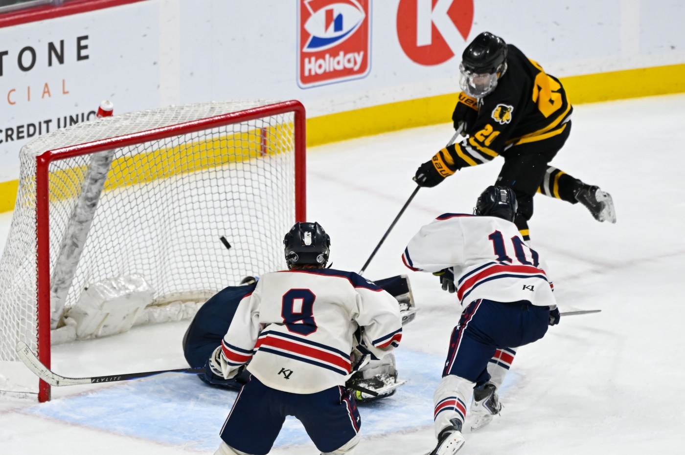 The Bluejackets received their reward for their offensive pressure with 8:36 left in the second period. Sophomore defender Whitaker Rewertz got the puck from his goaltender and made a sweeping solo move the length of the ice, beating Kennedy to tie it.