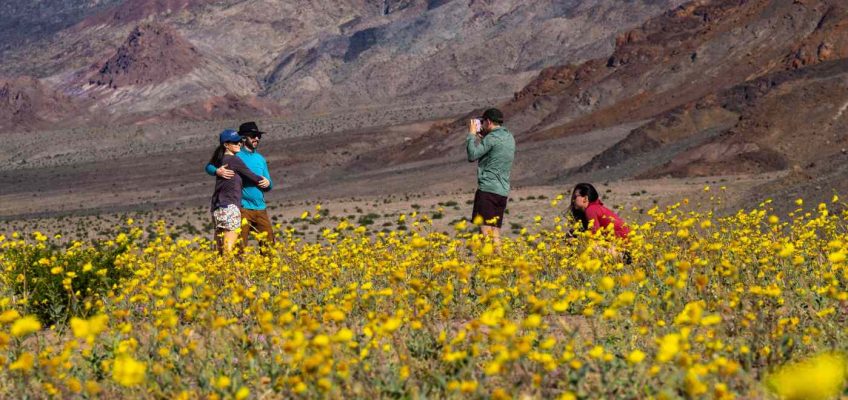 A couple has their picture taken as they and others walk amongst a cluster of desert gold wildflowers blooming near Ashford Junction at the southern end of Death Valley National Park on Saturday Feb. 28, 2026. Low-elevation flowers are blooming throughout the park and will likely persist until mid-late March, depending on the weather. Higher elevations will have blooms April-June according to the National Park Service. Thus far it is the best bloom in the park since 2016. (Photo by Will Lester, Inland Valley Daily Bulletin/SCNG)