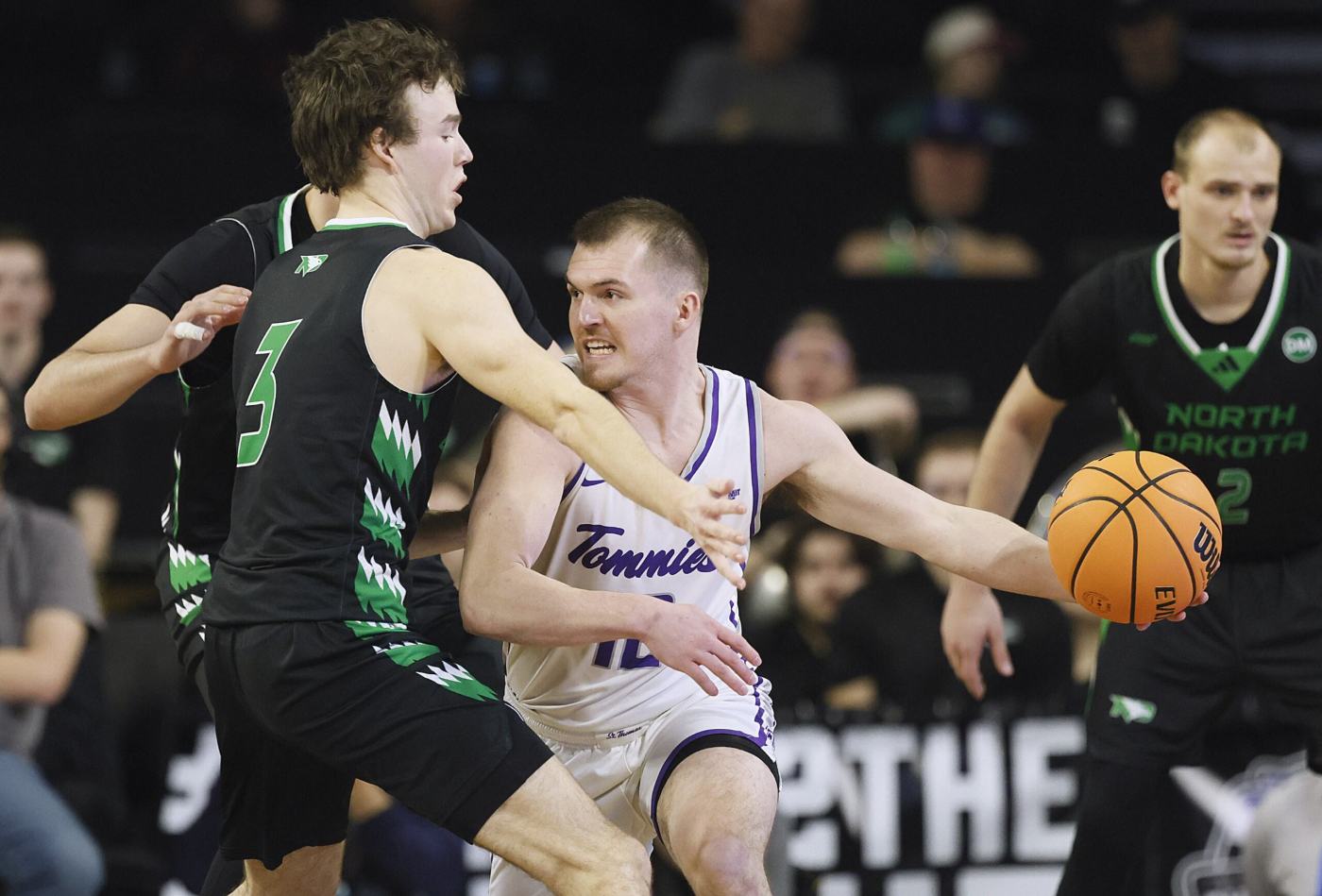 The Tommies led the game 34-28 at halftime, still held a 54-48 edge with 8:38 to play. But consecutive unanswered three-pointers by North Dakota evened the score with just over seven minutes remaining to set off a dogfight for the remainder of the contest.