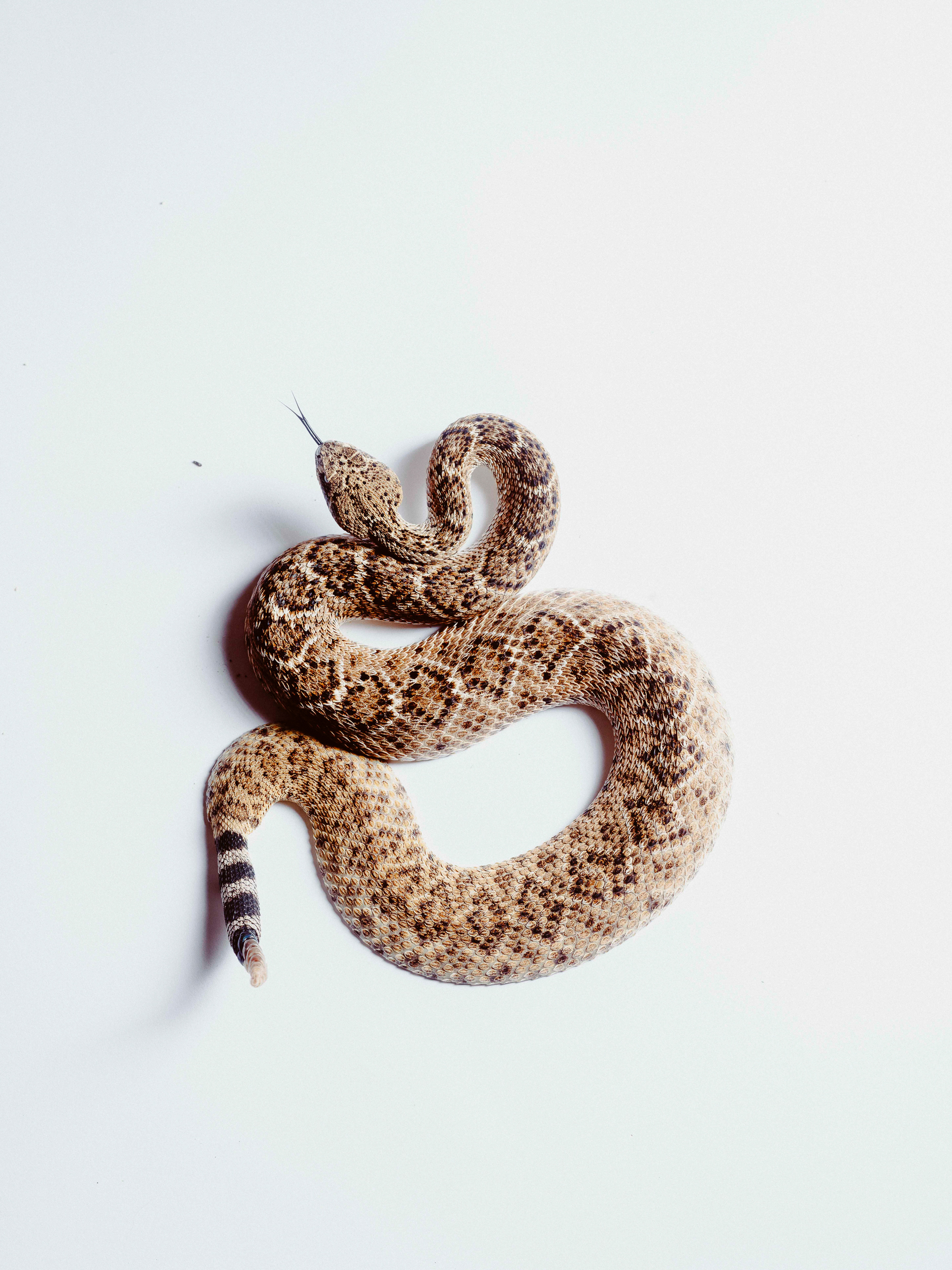 A little farther up the road, we stopped by a broad berm of sand beneath a tall game fence to take photos. The newborn stayed still, pressed flat against the sand to make itself look big, head turning now and then to follow the motion of the camera. Cars rocketed down the night road like passing death. Guadiana ushered the baby off into the darkness away from the blacktop, then brought out the young adult, which proved similarly pliant—to a point. At first, it hid its head under its coils when Guadiana tried to pose it for the camera, then tucked away its tail in a nervous huddle. As the minutes passed, however, the snake’s patience visibly ebbed. Finally, as Guadiana’s hook came in to make a small adjustment, the rattle came up buzzing, and the snake struck out at the metal. Fangs tinged against the hook.