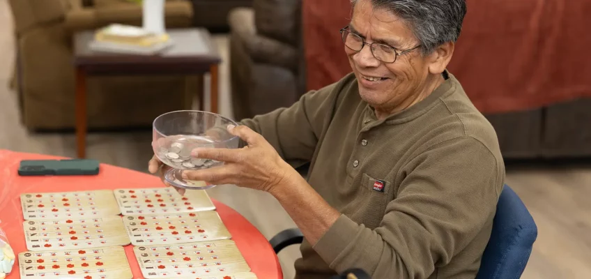 Ozona resident Alex Castañeda collects the nickel-per-game buy-in for bingo at the Crockett County Senior Center. (Reid Bader / Grist)
