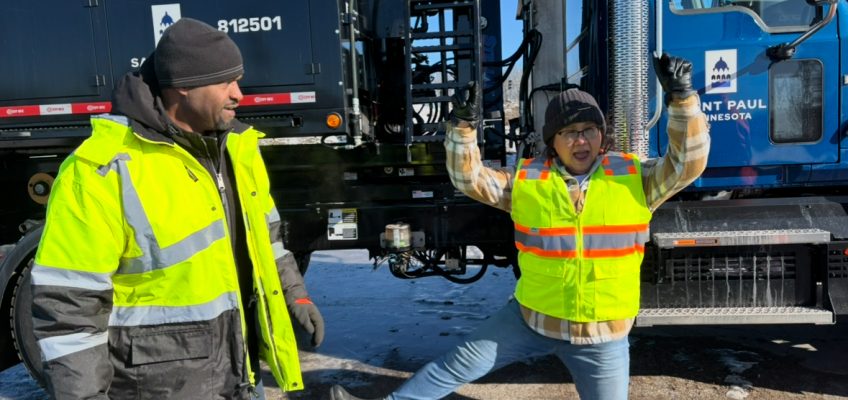 Joined by St. Paul Mayor Kaohly Her and St. Paul Public Works Director Sean Kershaw on Wednesday, Huggar and other Public Works officials showcased their “new-to-us” Bagela in action during a media event at a Public Works facility near Como and Western avenues.