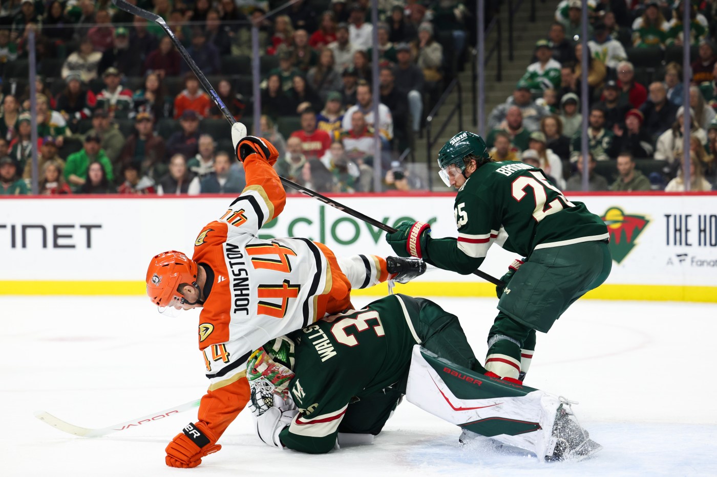 In stifling the normally high-scoring Ducks, Minnesota got 28 saves from Jesper Wallstedt — one half of what is looking more and more like a true goalie tandem — as the younger of the Wild’s two Swedish goalies improved to 4-0-2 as a starter. It was the second shutout of the season for Wallstedt, and the third of his career.