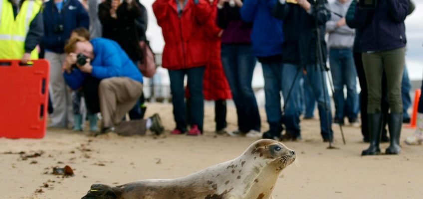 FILE – A hooded seal is released March 30, 2008, by the University of New England’s Marine Animal Rehabilitation Center in Biddeford, Maine. (AP Photo/Joel Page, File)